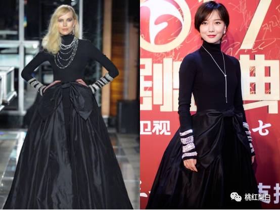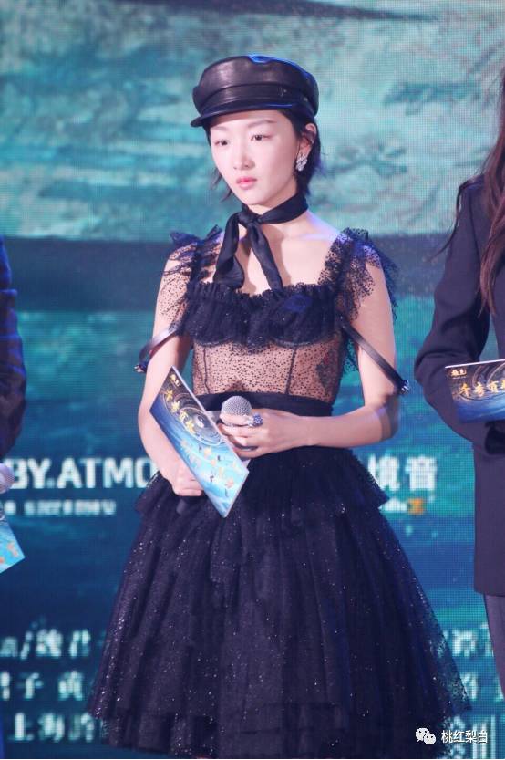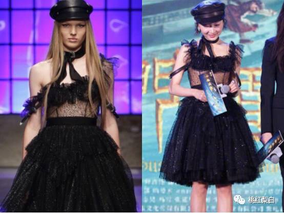 这件黑色薄纱透视裙,不管质地还是款式都使劲的把人往胖里穿,不管是秀场模特还是以清瘦著称的周冬雨吗,都没能逃过胖十斤的效果。不仅显胖,带上皮质鸭舌帽的周冬雨,总有种穿错衣服四不像的既视感,违和感十分严重。