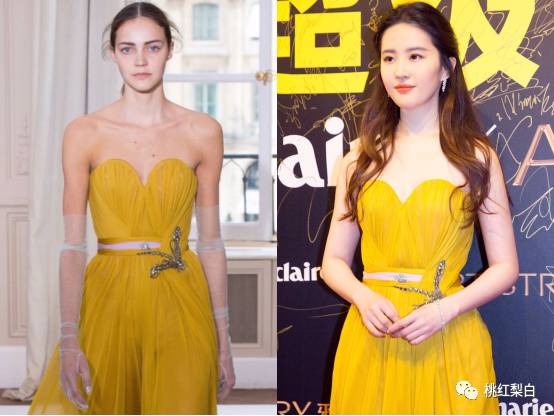 一样是参加时尚活动,刘亦菲选了条饱和度更高的明黄色长裙亮相,这种颜色一样很考验肤色,不过皮肤白皙的刘亦菲显然没在怕的,轻松hold住这一身,腰部系带的设计和裙尾层叠的薄纱也很为整体造型加分。