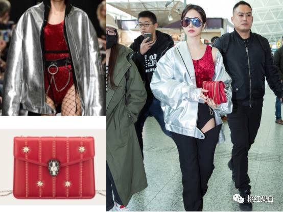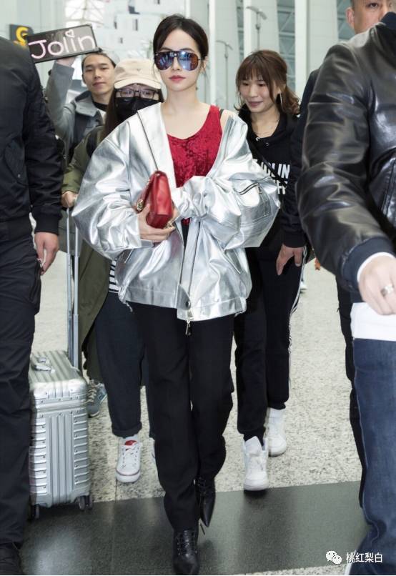 银色oversized棒球外套未来感很足,加上内搭的红色亮感天鹅绒连体衣,视觉效果特别抓眼球,黑色镂空直筒裤配高跟尖头短靴的组合,最大程度拉长了腿部比例,反正光看照片,绝对想不到她身高只有156cm。