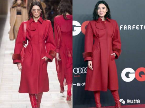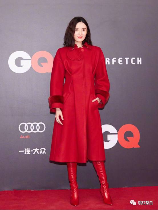 如果不是身形特别瘦削的类型,还是不要轻易尝试这种把大衣当连衣裙穿的造型了,厚重的质地和宽大的版型,直接把小宋佳穿成了一个大写的长方形,一身红的造型也略显密集,配上及肩小卷发,总有种挥之不去的厚重感。