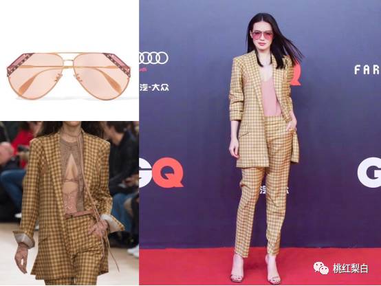 这种淡黄色格子西服套装其实并不好穿,搭配不好很容易秒变睡衣,但是舒淇利用一副粉色雷朋镜+一字带高跟鞋,就很完美的避免了这一尴尬,标志性随性披发也依旧和这一身很配,基本上是一套挑不出错的打扮。