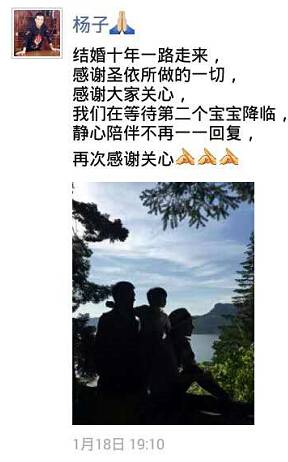 当晚,杨子也在朋友圈发声证实了爱妻怀上二胎的消息。