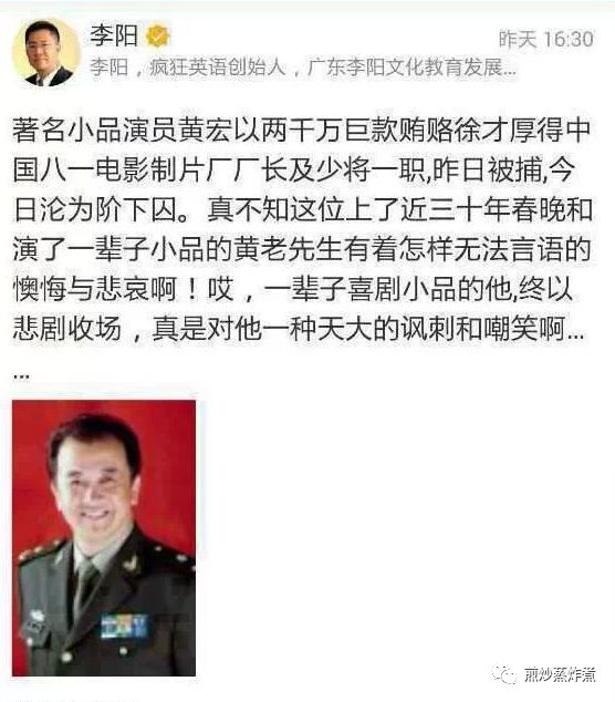 知名小品演员黄宏,以两千万巨款贿赂徐才厚得中国八一电影制片厂厂长及少将一职,昨日被捕,今日沦为阶下囚。真不知这位上了近三十年春晚和演了一辈子小品的黄老先生有着怎样无法言语的懊悔与悲哀啊!哎,一辈子喜剧小品的他,终以悲剧收场,真是对他一种天大的讽刺和嘲笑啊……