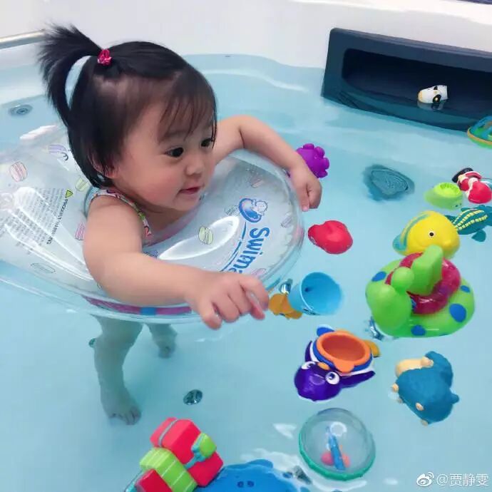 昨天,还在坐月子的贾静雯发微博说:抵不过女儿咘咘的要求,带着到室内浴缸里游泳玩水。。。。。