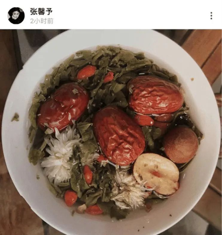 碗中装着很多红枣、菊花、枸杞和桂圆,这是何捷老家兰州的特色养生茶三泡台。但大家集中的焦点并不全都在这碗看起来很好喝的茶上。有眼尖的网友发现,这个大白碗有些地方已经破口了,但是还能被张馨予这个大明星继续使用,赢得了很多网友的好感。