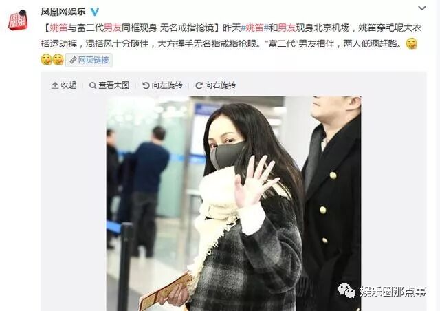 最近,有媒体报道,姚笛与新男朋友一同现身北京机场,而姚笛事先身穿毛呢大衣,而她的男朋友身穿一件灰色大衣,戴着一副眼镜,显得有些私文小气。