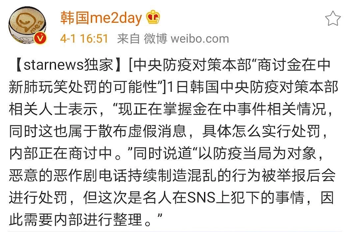 另有消息称金在中“散布虚假信息”可能被韩国中央防疫对策本部处罚。