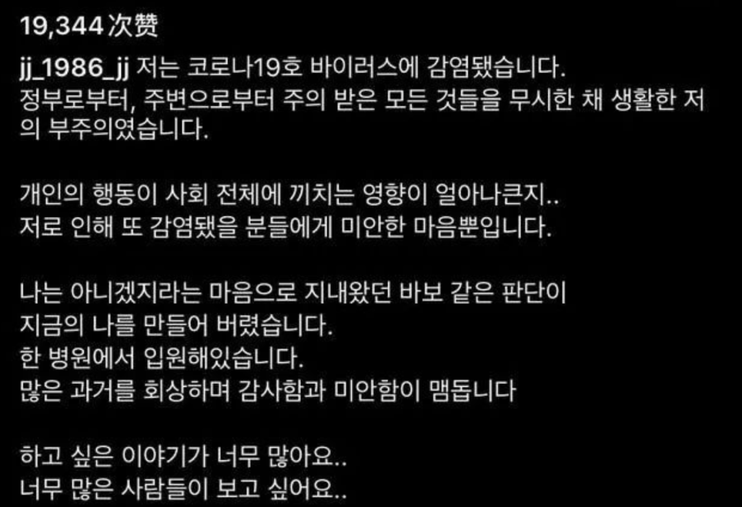 金在中在ins中写道:“我感染了新冠病毒。是我在生活上忽视了政府以及周边人给予的意见。个人的行为对整个社会的影响有多大,我只能对因我而感染的人表示歉意。”