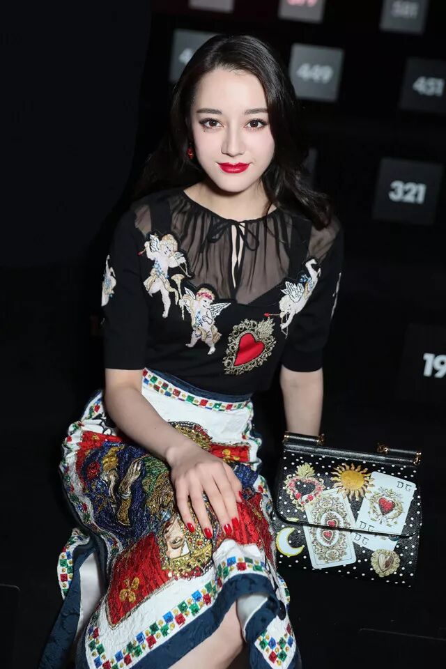 在DolceGabbana 秀场内,热巴身着薄纱羊毛短袖针织上衣,搭配纸牌印花半身裙,明艳十足,妩媚动人。手持Sacred Heart元素与纸牌图案装饰的Sicily手袋,与红心耳饰相互呼应,洋溢着浓郁的西西里风情。
