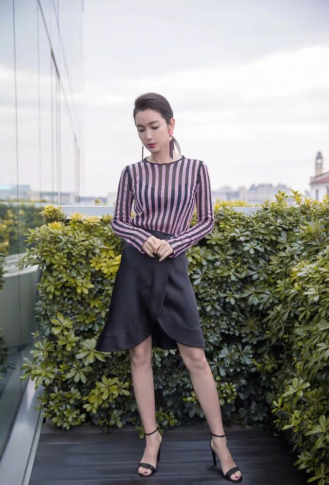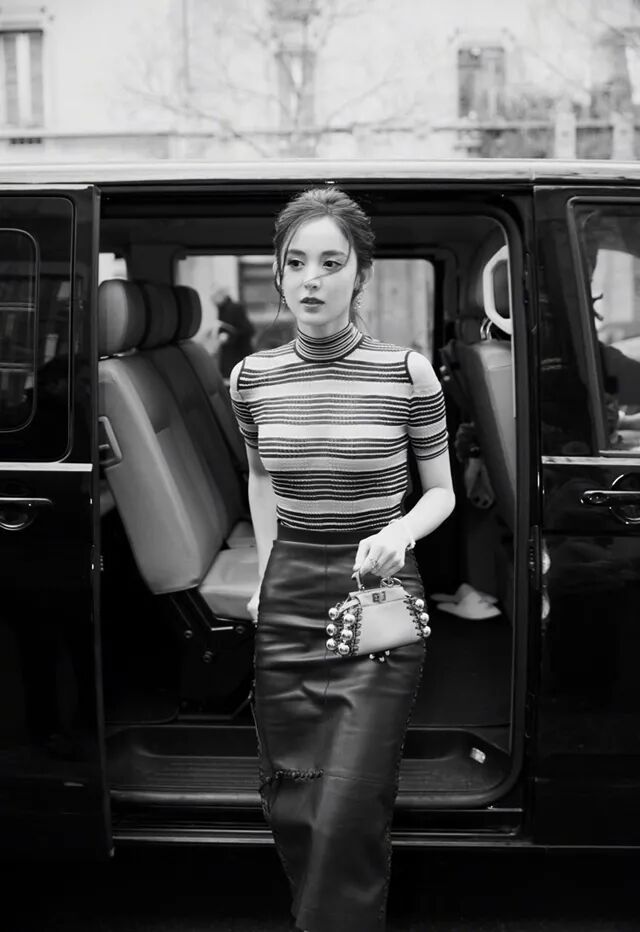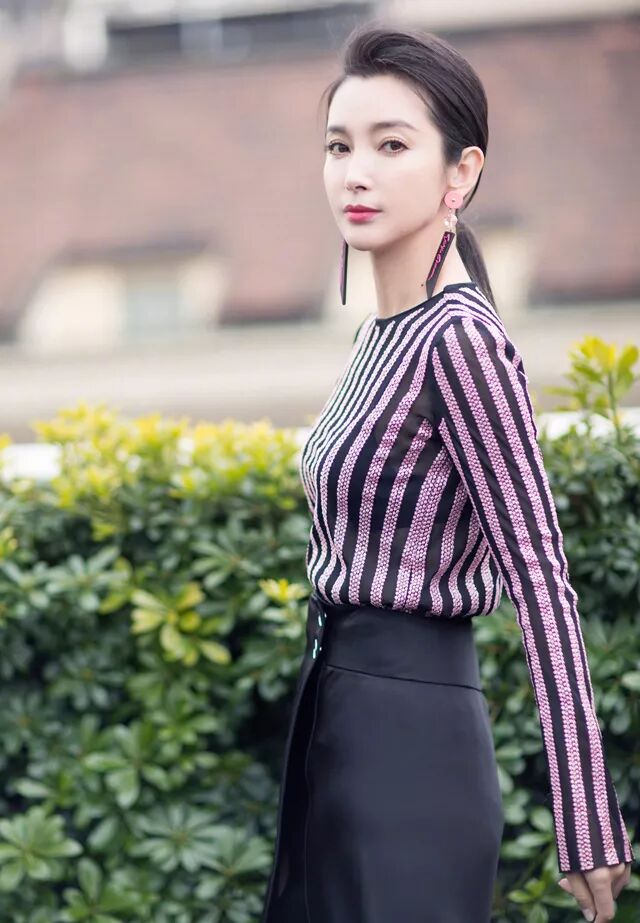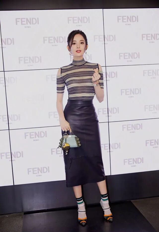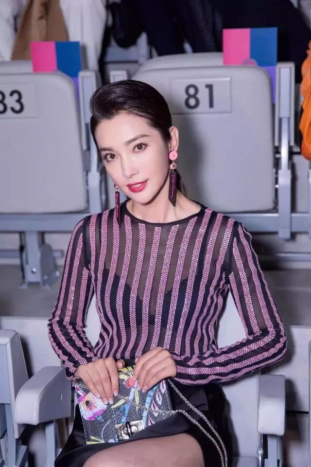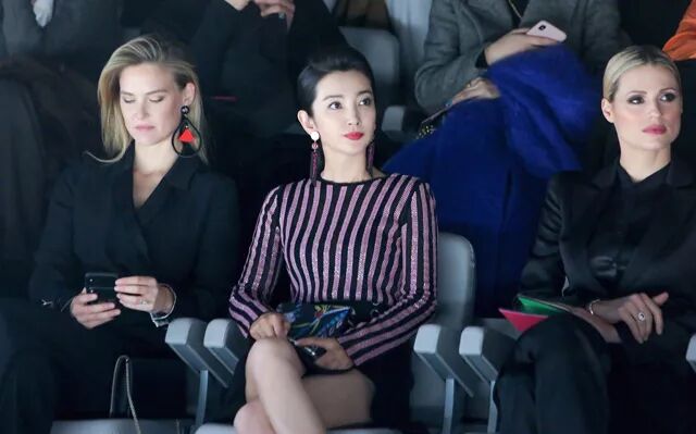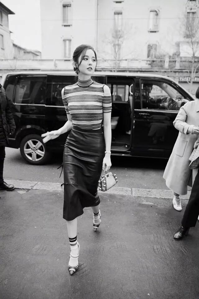在看秀时李冰冰身上穿的是Giorgio Armani 2018玫瑰色黑色条纹针织上衣搭配郁金香裙摆短裙,丝绸材质的半裙显得很干练,落落大方的同时摩登气息十足。