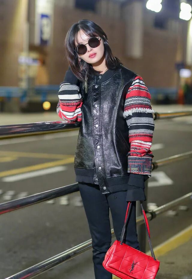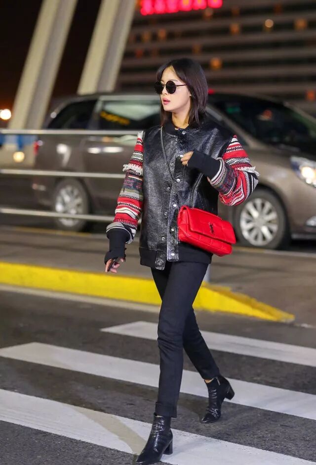 辛芷蕾受邀出发前往巴黎时装周,身着Saint Laurent by Anthony Vaccarello 18春季条纹袖黑色真皮TEDDY夹克,身背18夏季JAMIE红色拼接真皮链条包,简单又率性。