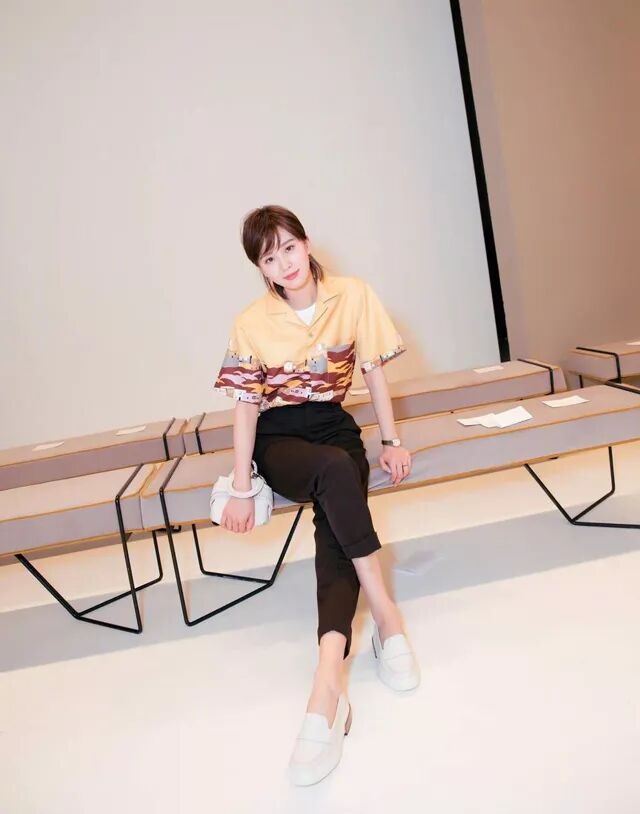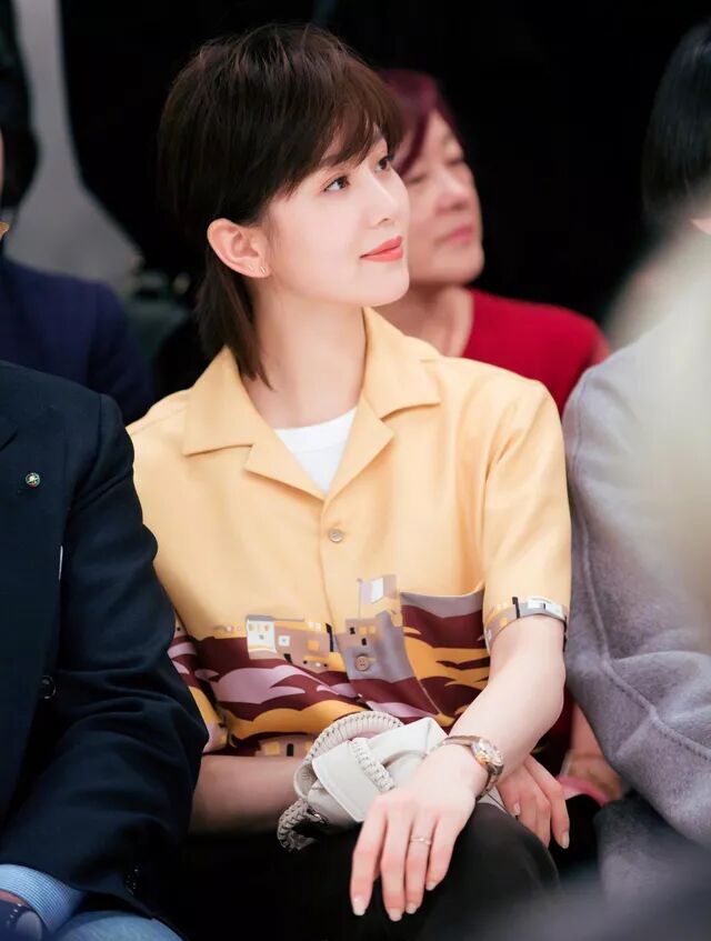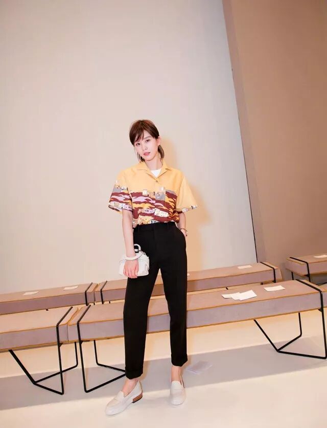 在秀场现身的刘诗诗选择的是一件夏威夷式的印花衬衫和黑色九分西裤的搭配,利落的短发和清雅的气质非常相配了。
