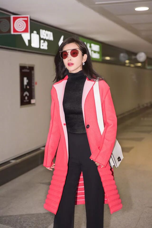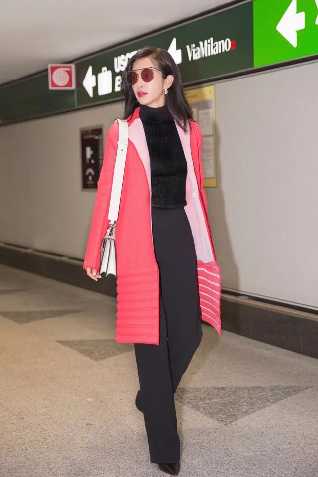 黑色高领衫和黑色阔腿裤的组合干练又显瘦。珊瑚红色风衣很显眼,不过普通人驾驭起来有些难度哦。茶色墨镜是增强时髦感的点睛之笔~