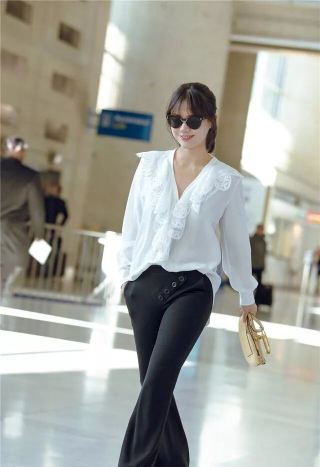 马思纯机场启程,身着蕾丝点缀的白色丝质上衣与黑色扣子装饰长裤,搭配半月形手袋。简洁精致,随性自在地开启了二度巴黎时装周之旅。