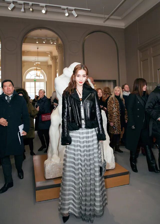 在秀场外的baby选择了保暖的机车皮衣和薄纱的曳地礼裙,有种“朋克甜心”的感觉,一柔一刚,时髦得刚刚好。