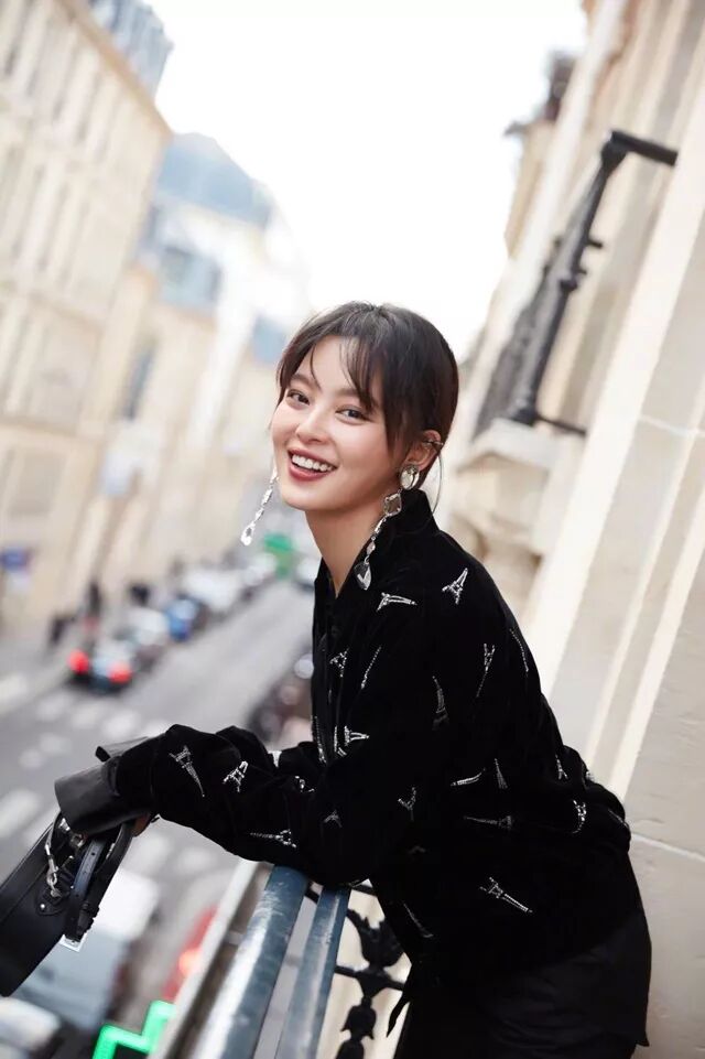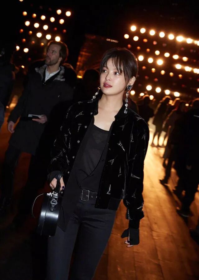 秀场内,辛芷蕾身穿点缀了埃菲尔铁塔印花的黑丝绒棒球衫,耳旁悬挂着浮夸的耳饰。整体造型摩登现代,风格简约利落,和她率直爽朗的个性很是般配。