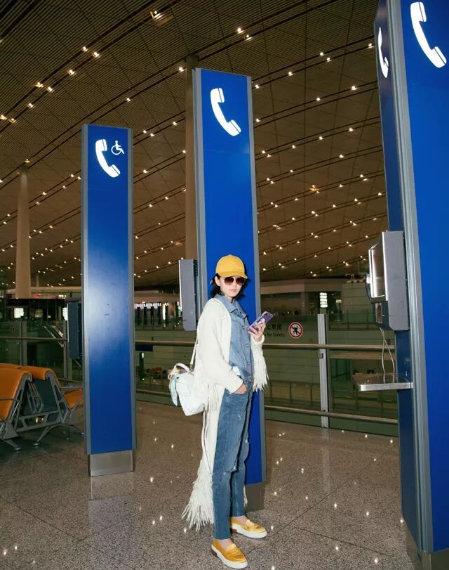 刘诗诗选择的蓝色套装与白色长款流苏毛衣的搭配仙气十足。点亮整个造型的金色太阳镜和乐福鞋更是让诗诗优雅与俏皮兼具。