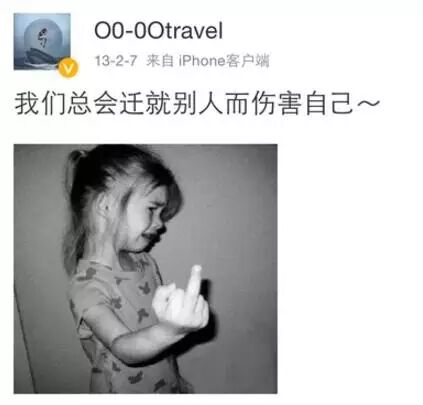 和魏晨相反的是,另一位当事人于玮则不声不响删除了大部分微博,只留下一条“我们总会迁就别人而伤害自己。”配图是一个对着镜头竖起中指的小女孩儿,似乎有点儿耐人寻味。