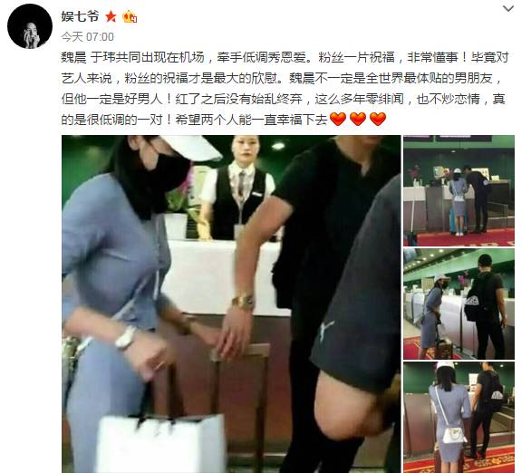 腾讯娱乐讯(文/李小栗)6月22日清晨,微博账号“娱七爷”曝出了一组魏晨和“女友”于玮在机场的亲密照片,配文说到“魏晨不一定是全世界最体贴的男朋友,但他一定是好男人!红了之后没有始乱终弃,这么多年零绯闻,也不炒恋情,真的是很低调的一对!”