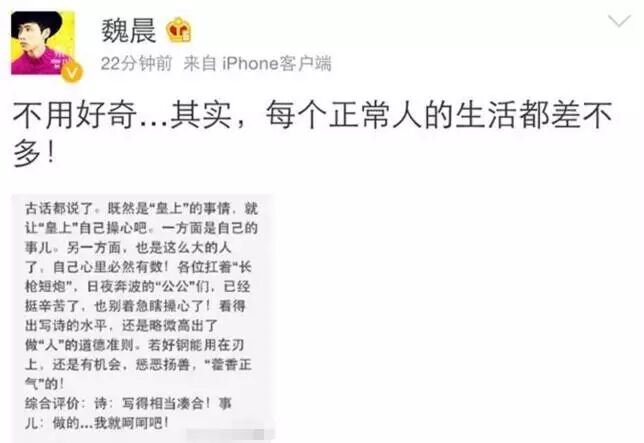 有些魏晨的粉丝也表示,这个时代的偶像,结婚生子都不是什么见不得人都事。很多人都十分懂事贴心的纷纷送上祝福——