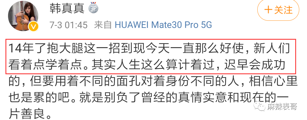 06超女韩真真也下场,暗指有些人14年了还是抱大腿,人生算计着过。