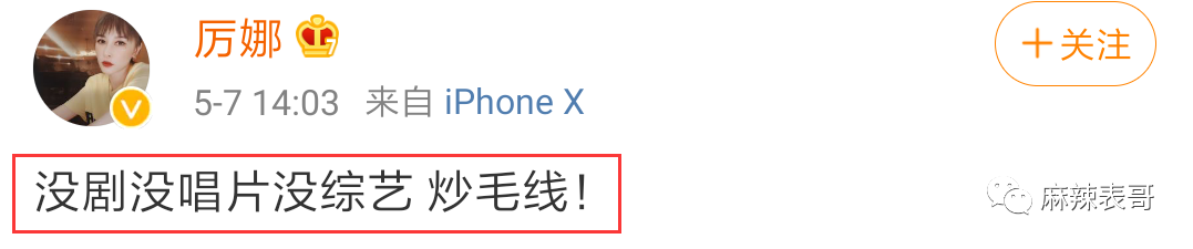 有许飞粉丝质疑厉娜为了热度炒作,厉娜回应“没剧没唱片没综艺,炒毛线。”