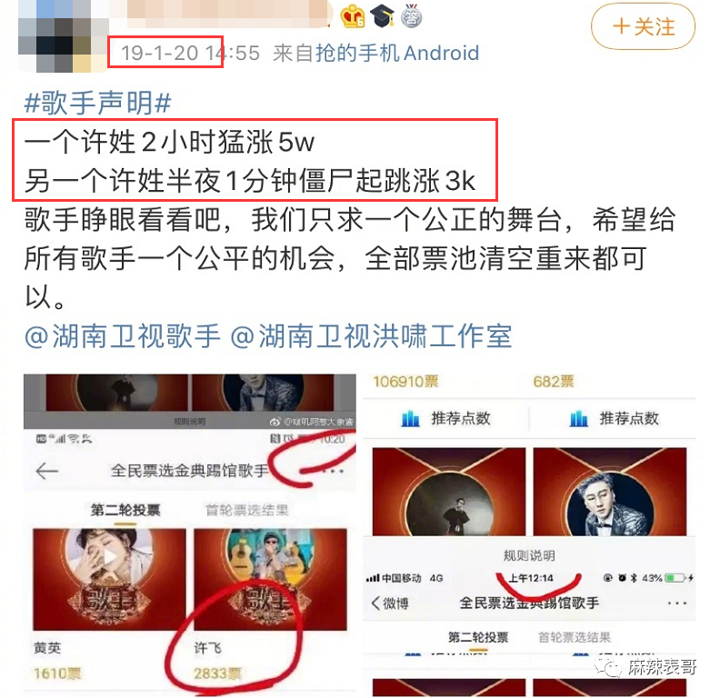 包括2019年《歌手》的踢馆赛,因为部分歌手的票数存在明显异常,有刷票行为,官方不得不发声明。