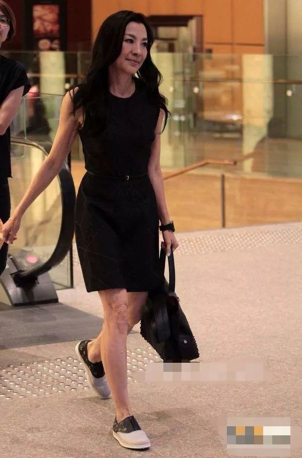 杨紫琼披着黑色的卷发,看上去非常温柔。他穿的是一体的黑色紧身连衣裙,腰间用一条黑色的腰带,突出腰线。脚上配的是平底休闲鞋。