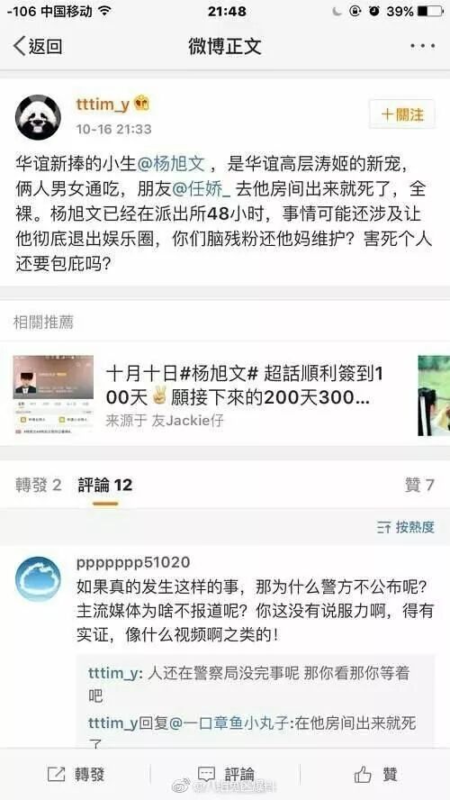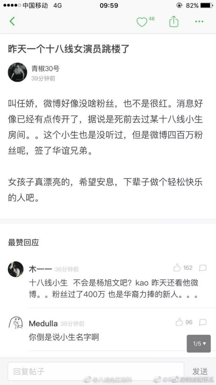 10月16日晚上9点多,女星任娇逝世。逝世之前任娇曾去过杨旭文房间,后出事时还是全果状态。