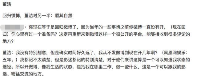 近日,董洁接受了相关媒体的采访,首次回应了时隔五年突然回归微博,她表示:我没有特别刻意,但是确实时间好久远了,我从不发微博到现在开几年啊?我都记不太清楚,但是影迷都记的特别清楚,对于他们来讲这算是一个可以知道我状态的途径。所以开微博,像我生活的状态,包括我在哪里工作,做一些什么,这是一个可以跟我的影迷、粉丝交流的地方。