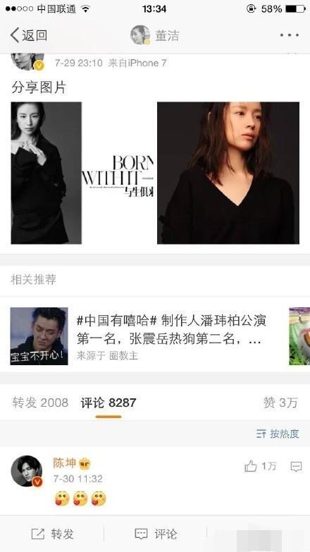 据悉,7月29日董洁微博分享了两张美照,没有任何配文,时隔五年,陈坤前排暖心评论,当初那个《金粉世家》中的“冷清秋”又回来了。时隔多年金燕西依然爱着“她”。