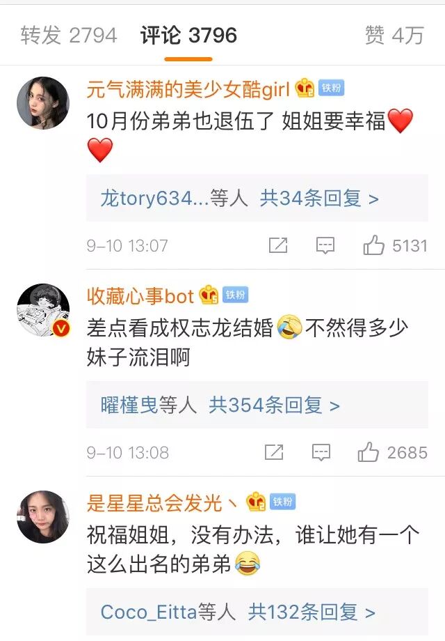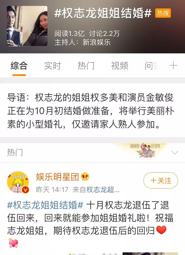 得知此消息的GD粉丝们,纷纷前往该热搜词条下,为权达美送上新婚祝福,同时也有一部分粉丝向不明所以的路人们给出了解释,“毕竟是巨星的姐姐,上个热搜也正常。”