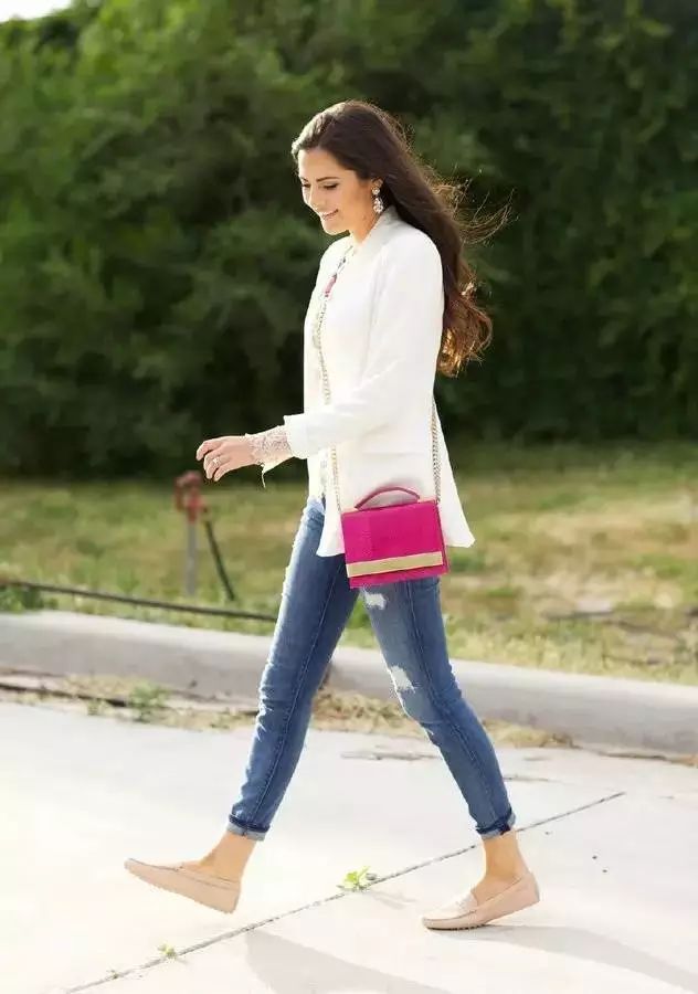 周五当然就businiess casual (商务休闲)啦~ 牛仔裤抖出来。个人觉得最百看不厌的周五造型就是白衬衫+破洞牛仔+平底鞋+亮色小宝,用金星的话说:完美~