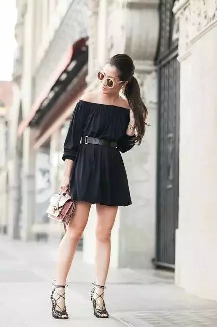前头说到,大幂幂工作时间老喜欢连衣伞裙,你们感受下,黑色款来自小香;不过今年流行“一字肩”,少女幂也是没拉下。“一字肩”素来有遮手臂美誉,这种有大片布料在前头的格外好。