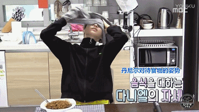 96年的姜丹尼尔,吃泡面时,就用毛巾把头发给包起来了。