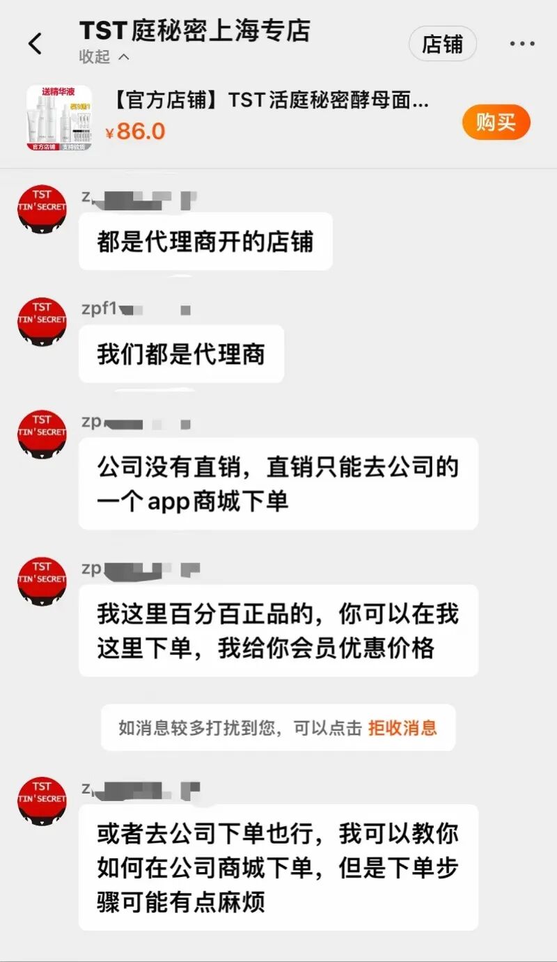 11月8日,南都记者检索发现,在多个电商平台仍有大量TST的护肤产品在售,店名分为“总店”“企业店”等,客服称不同店铺为不同代理商开的网店。相关产品链接下,网购者的评论时间显示近期仍有消费者购买,而在商品链接的消费者交流“问大家”一栏,有部分用户提问TST是否传销、“创始人是否被抓”等。