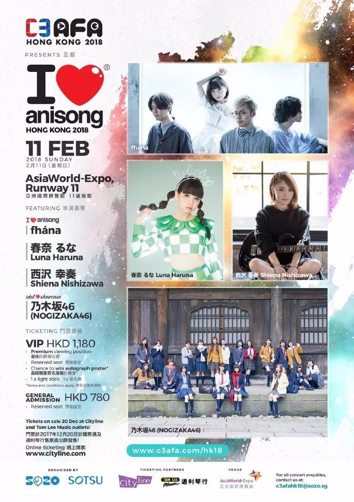 由《C3》与《AFA》两大活动品牌结合而成的新活动《C3AFA》,将会把更多日本的精彩内容带来香港,呈献给喜欢日本文化的人士。 表演嘉宾:fhána,春奈露娜,西沢幸奏,乃木坂46