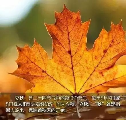 立秋,是二十四节气中的第十三个节气,是干支历未月的结束以及申月的起始,时间在农历七月初一前后(阳历8月7—9日)。对中国人来说,立秋的重要性在于,它是反映一个太阳年季节变化的八象八节之一,它是中国最早的节气之一。