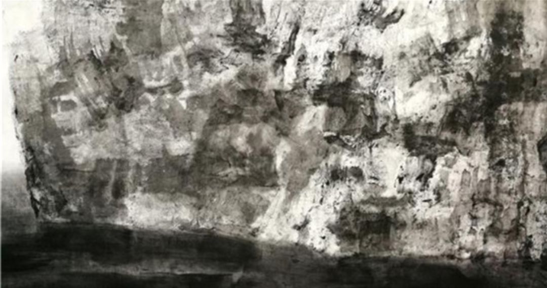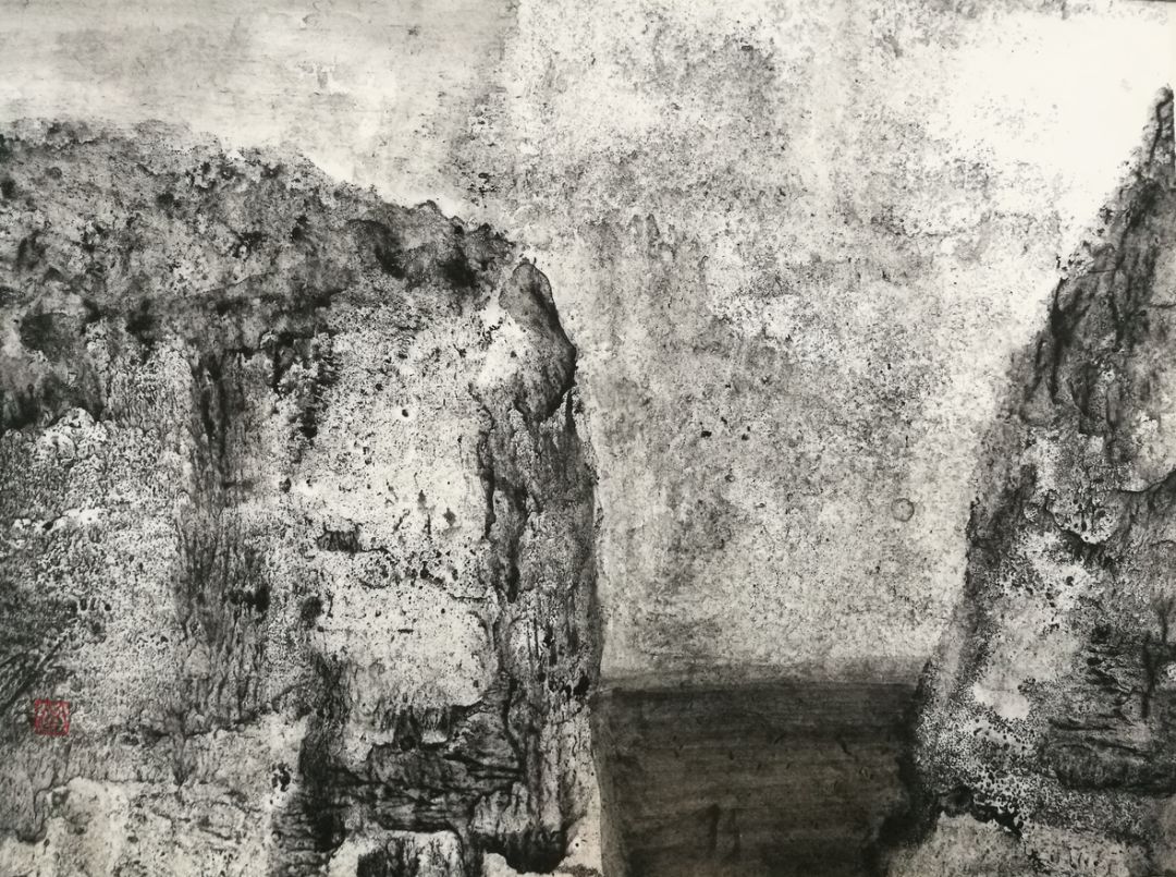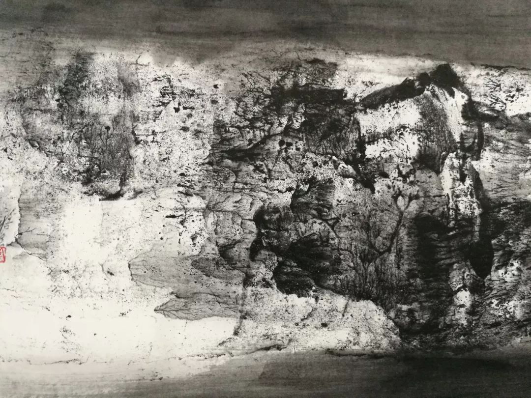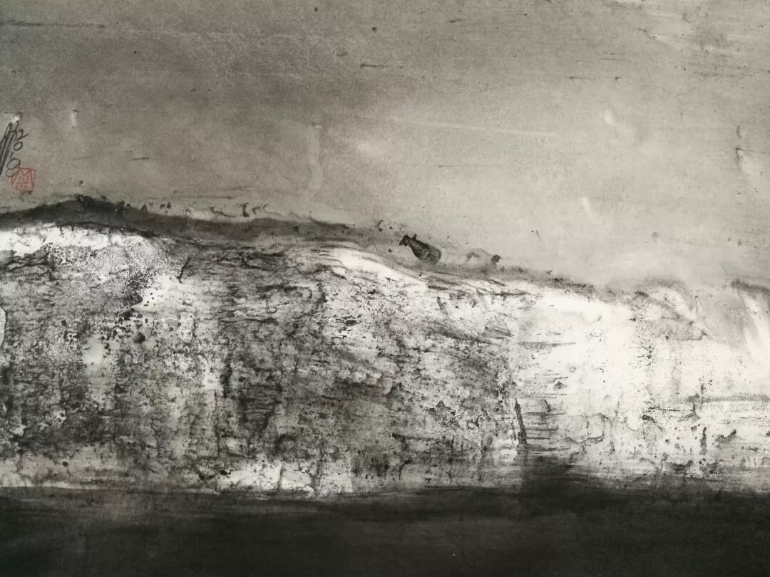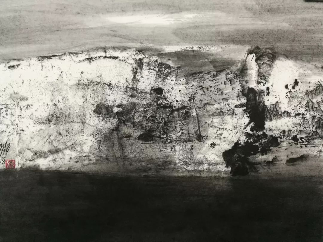 而米金铭现在的白鹭湾已经脱离了地理空间的限制,是广义上的白鹭湾,通过有限的取景来表达对整个生态自然由表及里的认识。其中,具象的表达越来越少,在图示的构建上越来越抽象,图景变形到与实景仅留一线的牵扯,使之水墨呈现出一种“荒诞”的审美形态,而这种“荒诞”并不趋向于悲,反而生出一种和谐。你会想知道:眼前的这一片荒原,从前是什么,今后又会是什么?同时,在笔墨的形式上,米金铭做了更大胆的尝试,笔法呈现出更加独立的表现功用,空间表现力扩张,也得到了更加独特而准确的肌理效果。