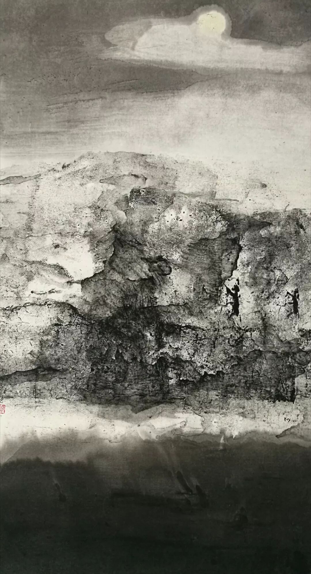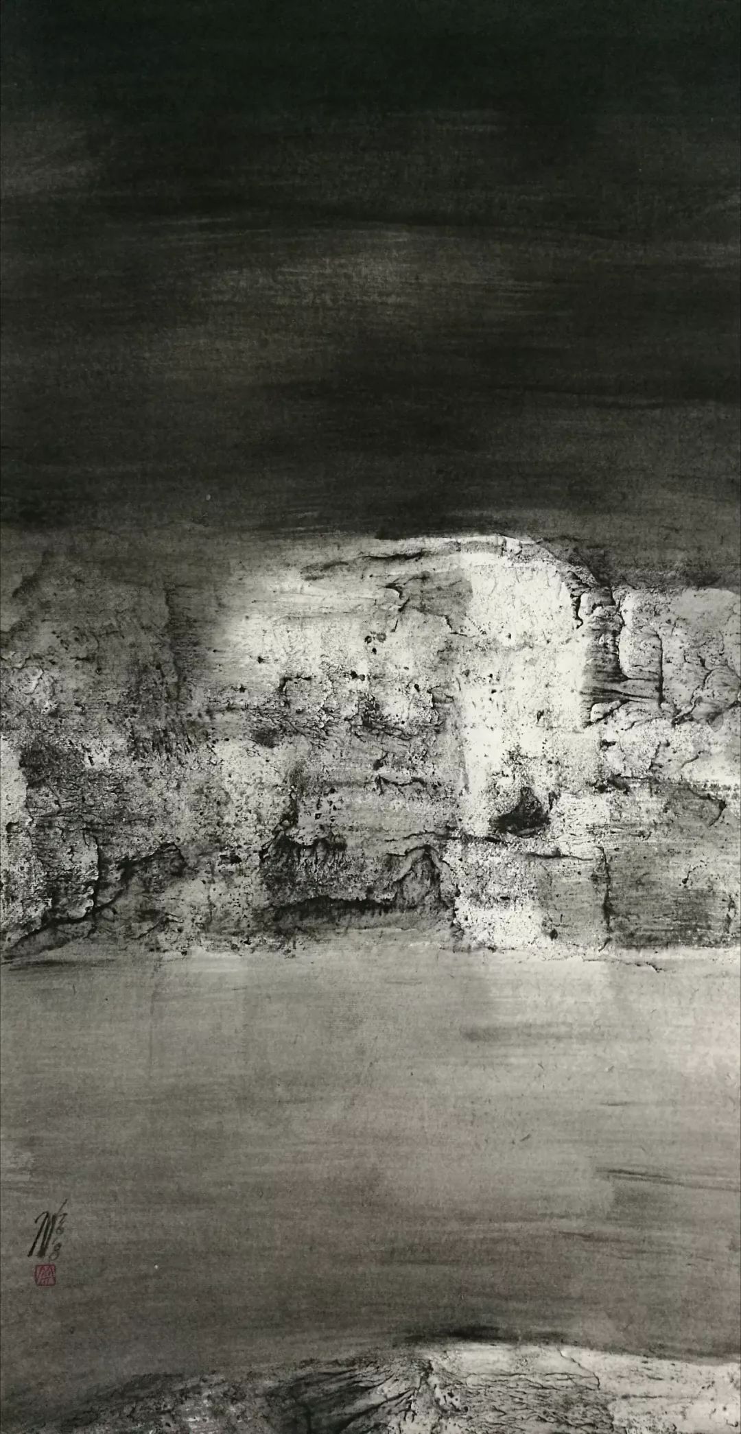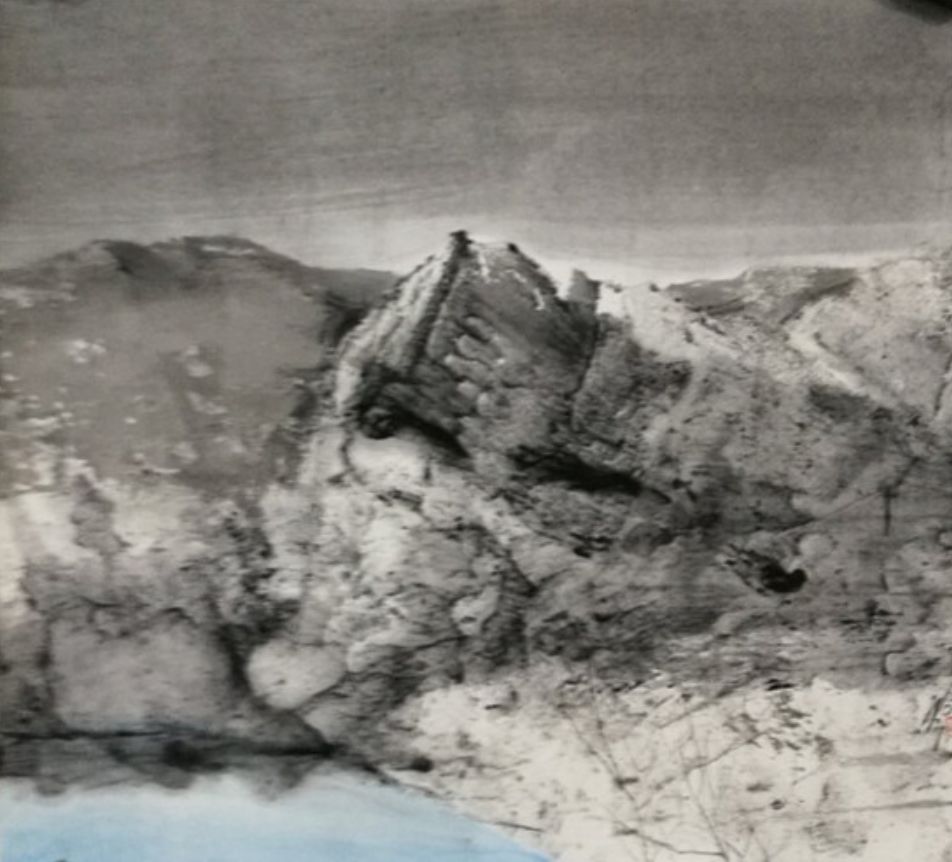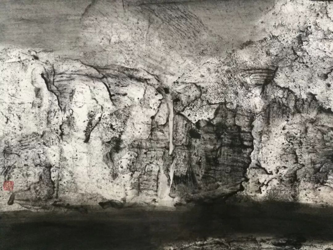 而米金铭现在的白鹭湾已经脱离了地理空间的限制,是广义上的白鹭湾,通过有限的取景来表达对整个生态自然由表及里的认识。其中,具象的表达越来越少,在图示的构建上越来越抽象,图景变形到与实景仅留一线的牵扯,使之水墨呈现出一种“荒诞”的审美形态,而这种“荒诞”并不趋向于悲,反而生出一种和谐。你会想知道:眼前的这一片荒原,从前是什么,今后又会是什么?同时,在笔墨的形式上,米金铭做了更大胆的尝试,笔法呈现出更加独立的表现功用,空间表现力扩张,也得到了更加独特而准确的肌理效果。