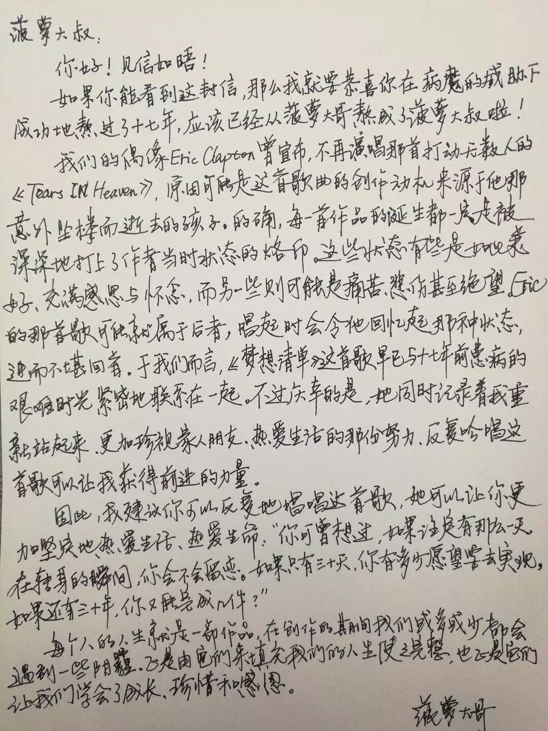 我的偶像Eric Clapton曾宣布,不再演唱那首打动无数人的《泪洒天堂》,因为他已经走出了丧子的悲伤岁月,变得坚强。