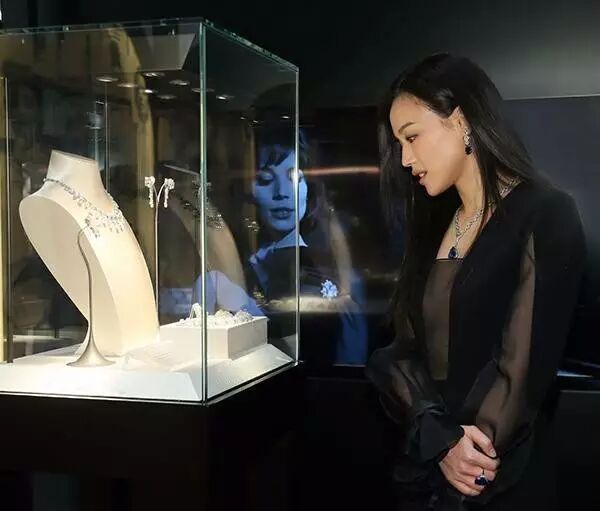 舒淇佩戴蓝宝石白钻镶嵌高级珠宝套装亮相。黑色透视装的性感在珠宝的华彩之上更有质感。