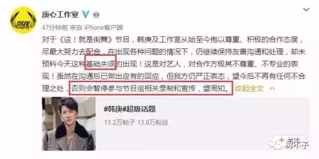 这完完全全就是专业素养的问题,韩庚的工作室自然也就不爽啦——