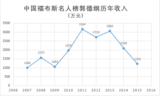 据历年的《中国福布斯名人榜》,郭德纲从2007年开始上榜,此后收入逐年递增,最高峰是2011年至2013年之间的三年,此后收入就开始了下滑。并且记住一点,福布斯的榜单年限,统计的实际上是前一年的收入,也就是说,郭德纲的娱乐帝国在2012年之后就开始走下坡路了。