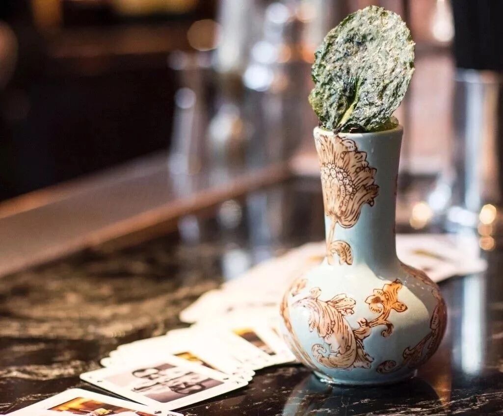 酒品突出以外,细节处也加分不止,盛放鸡尾酒的银质杯垫满布繁复花纹,更有以小花瓷器为器皿的特调,与酒吧典雅装潢相得益彰。