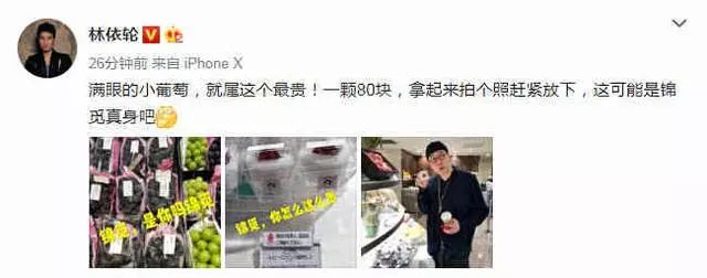 林依轮在微博上晒出天价葡萄,卖到一颗80块的天价。首次看到论颗卖的天价葡萄,惹得林依轮也举着葡萄合影“满眼的小葡萄,就属这个最贵!