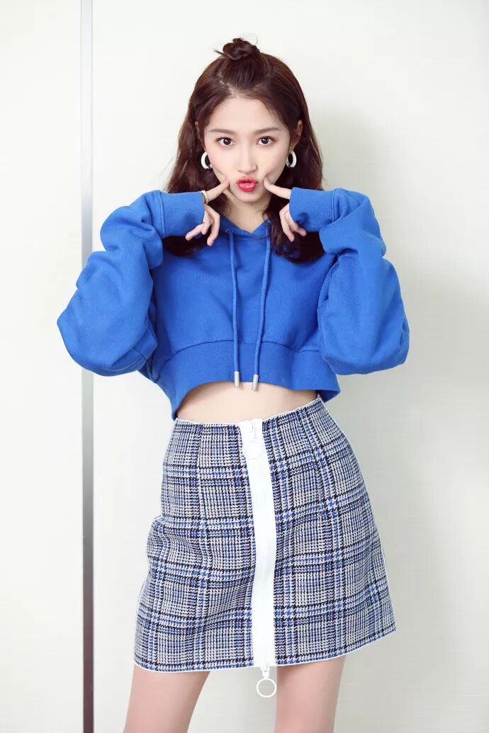 ▲ 《凤囚凰》的发布会上一身蓝色短卫衣+格纹短裙,身高优势加上大长腿,这一套娇憨可爱。
