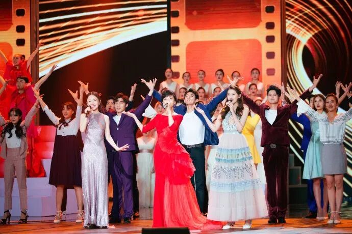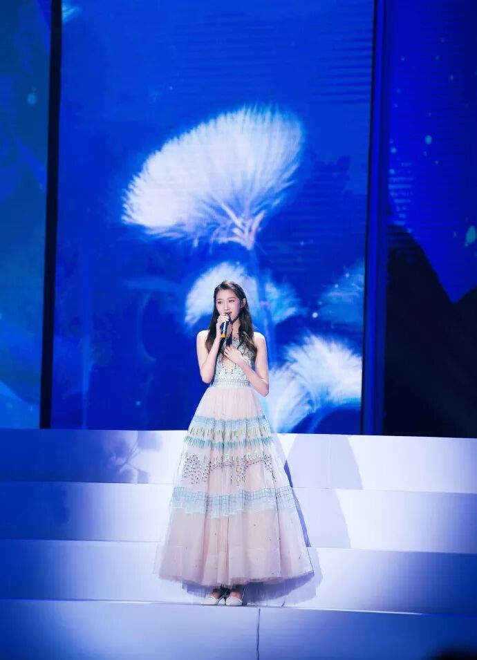 ▲晚会现场她换了身Temperley London礼服,与赵雅芝、霍思燕合作情景歌舞秀《光影留芳》。一曲《绒花》献给与梦同行的女性影人。这一套礼服很符合她的年纪,印花图案凸显晓彤的俏皮可爱。