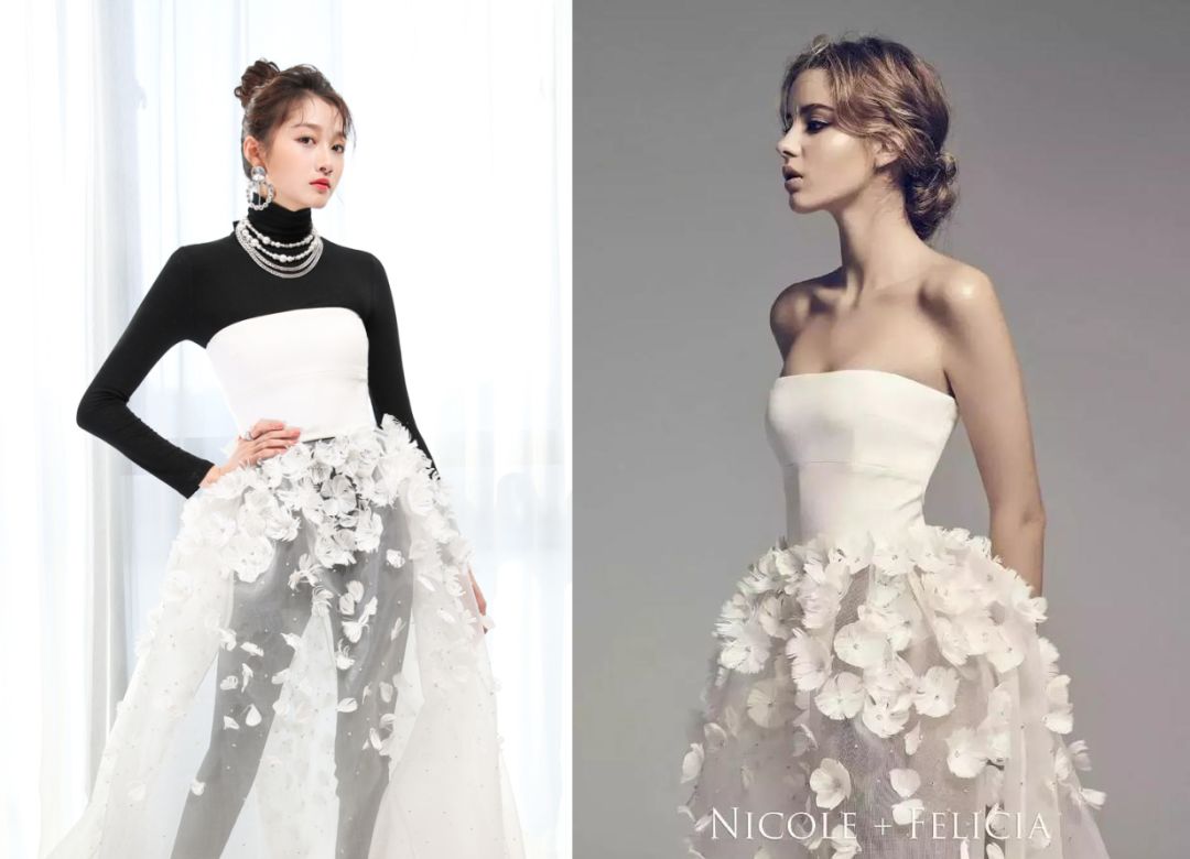 ▲槽多无点的这一身秋衣秋裤礼服,让关晓彤承受了无比大的非议。原来是条nicole+felicia抹胸缀花装饰白色蓬蓬裙,却加上了老气横秋的高领黑色打底衫+黑色袜裤+老气珠宝,造型的确一言难尽。