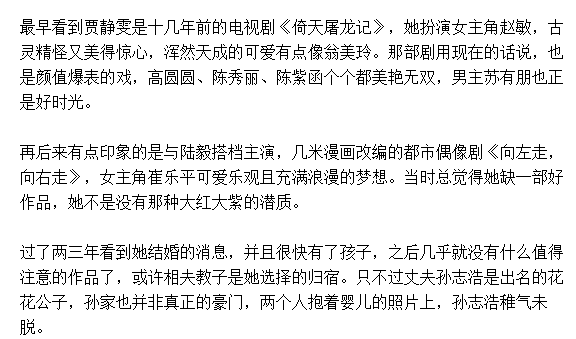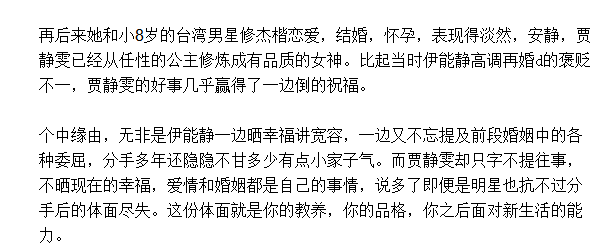 贾静雯的经历再次证明,女人过得幸福才是最好的养颜秘方,爱情也和年龄无关。想要幸福,你就得自己去努力,先让你人生的每一个部分都过的值得和美好,无怨和无悔。真爱的那个人,一定会爱上你的全部。